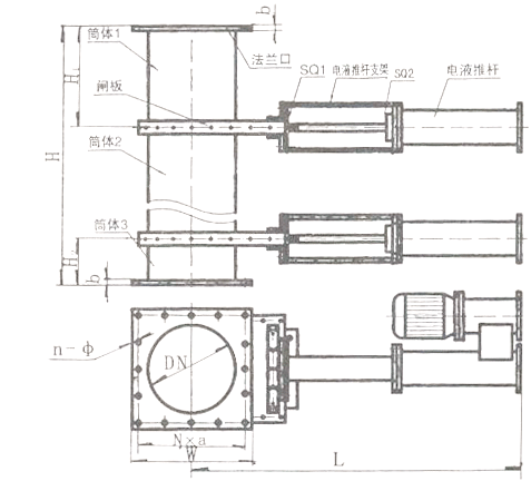 本閥為機、電、液、控于一體的卸料裝置,接通電源后,上閥電液推桿自動打開閘板,至限位開關(SQ2)后,停留數(shù)秒卸料,然后關閉上閥閘板,至限位開關(SQ1)后轉入下閥工作,下閥電液推桿打開閘板至限位開關(SQ4)后,停留數(shù)秒卸料,然后關閉下閥閘板至限位開關(SQ3)后轉入上閥工作。如此交替工作,至設定的卸灰量后,自動停止全過程工作。
